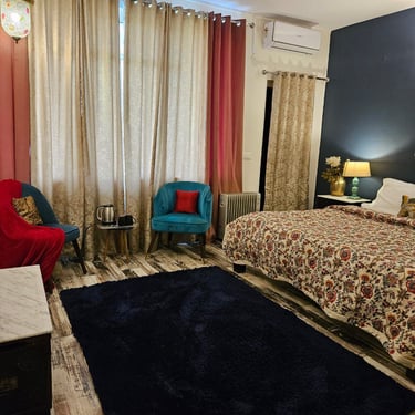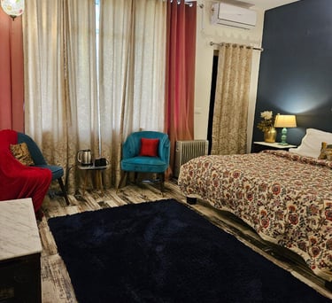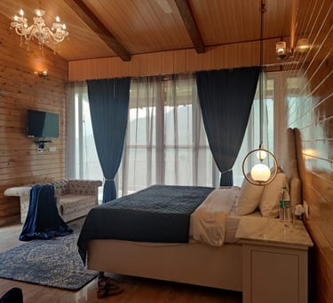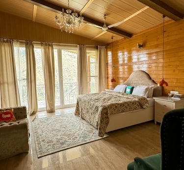 The Luxury Rooms at The Brigadiers Cottage offer cosy spaces for up to 3 guests. Elegantly designed with wooden interiors, they come with amenities like a television, tea/coffee maker, and complimentary breakfast. Large windows and a common balcony provide stunning views of Mussoorie!